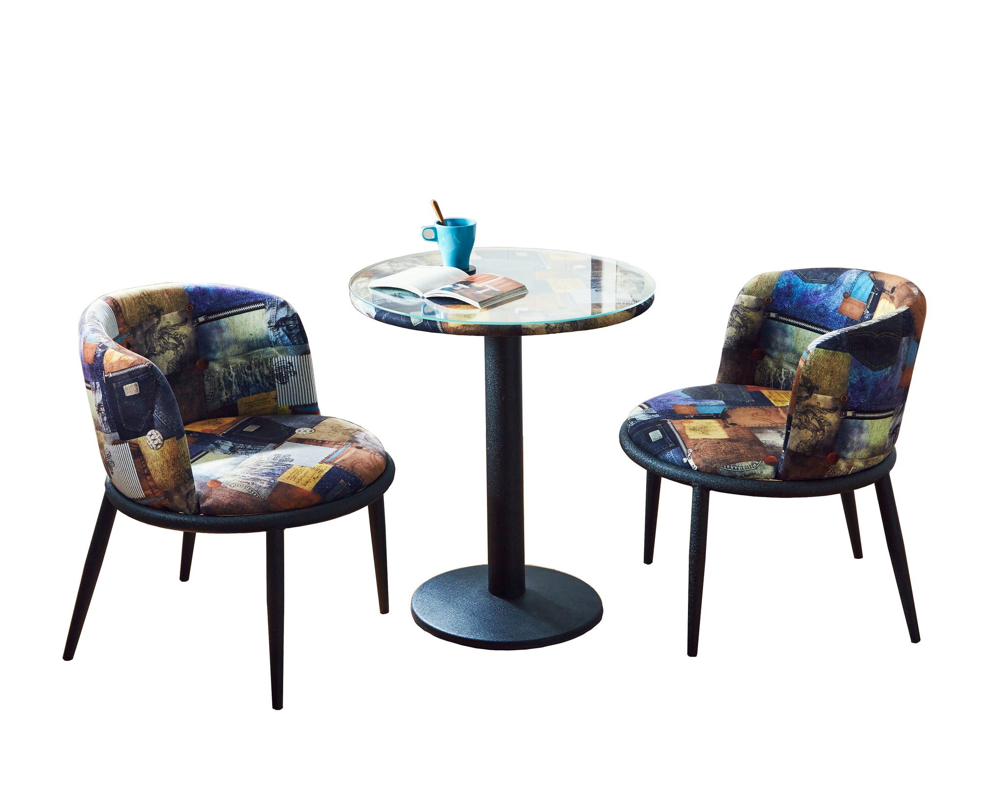 【商品について】お洒落な丸テーブルのカフェセット。テーブルの天板は強化ガラスなので、お手入れが楽です。