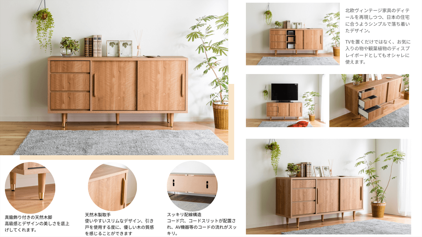 【商品について】収納力抜群の150サイズですが、圧迫感が無いデザイン テレビ台としても使用可能です カラーによって脚と取っ手も変えています。