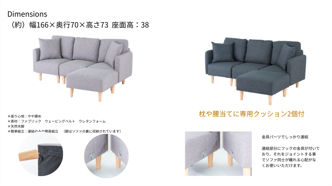 【商品について】コンパクトサイズで部屋を広く使えます 座面も通常より少し低めなので座るのが楽です オットマンは単体でも使えます 可愛いクッション2個付です