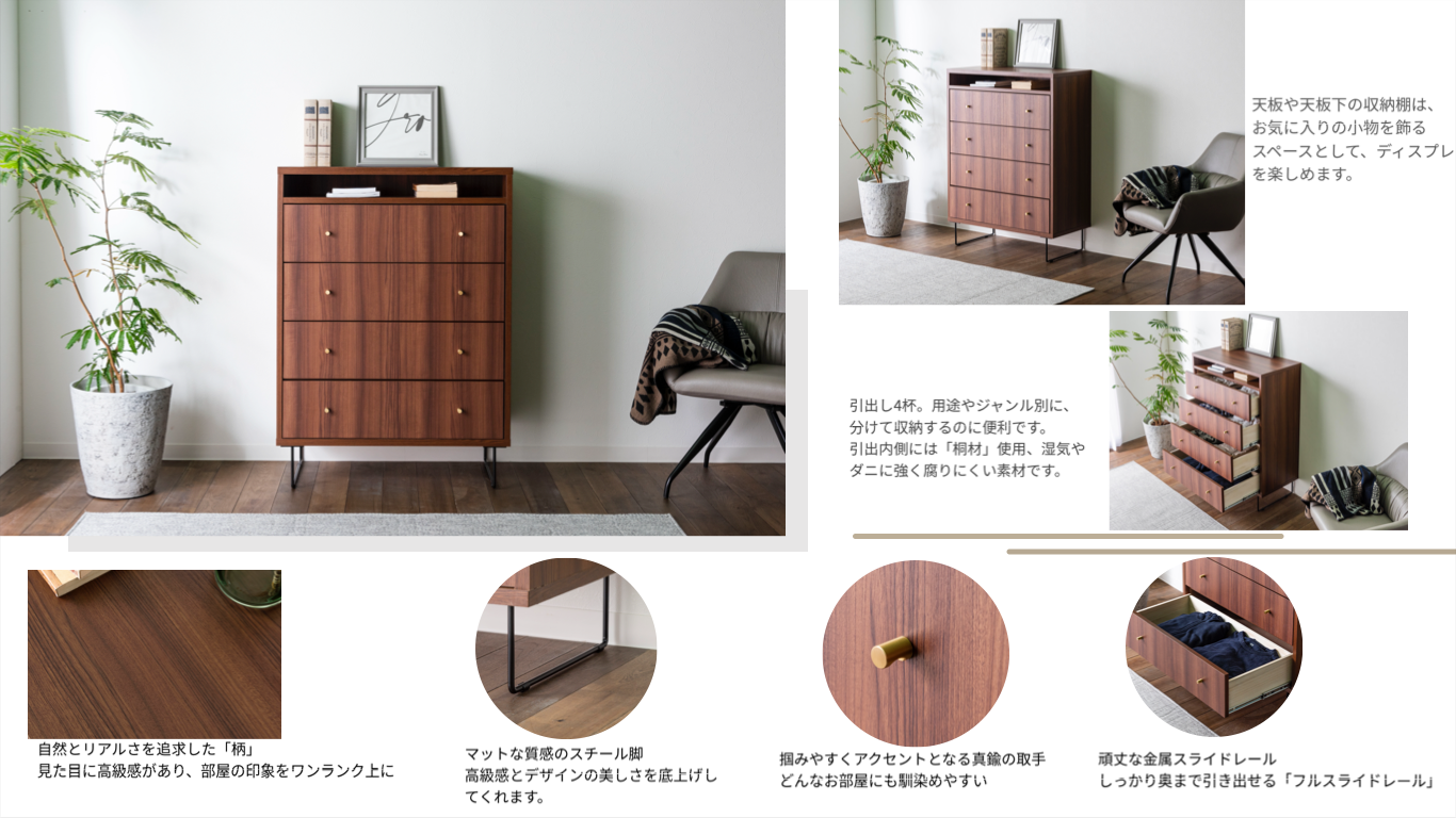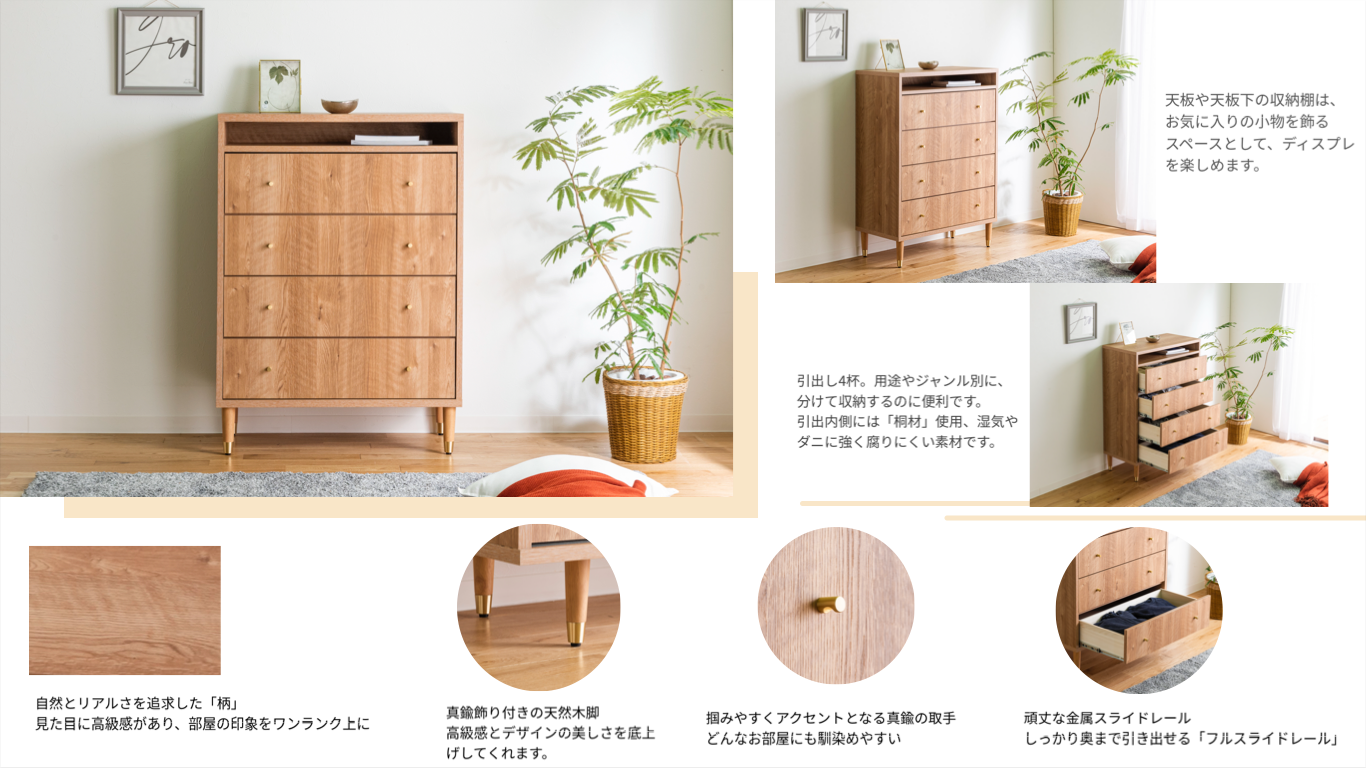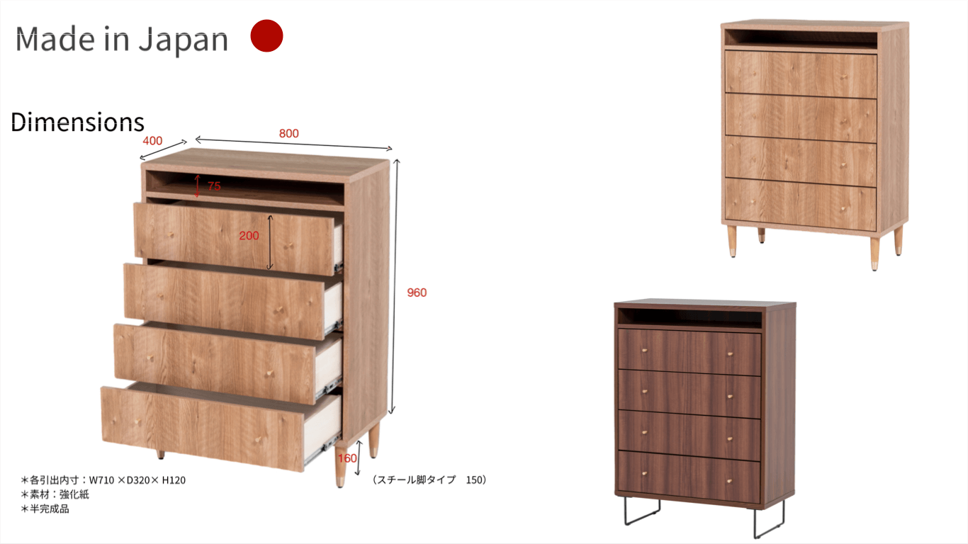 ハイチェスト 80cm幅 4段 日本製 脚付き